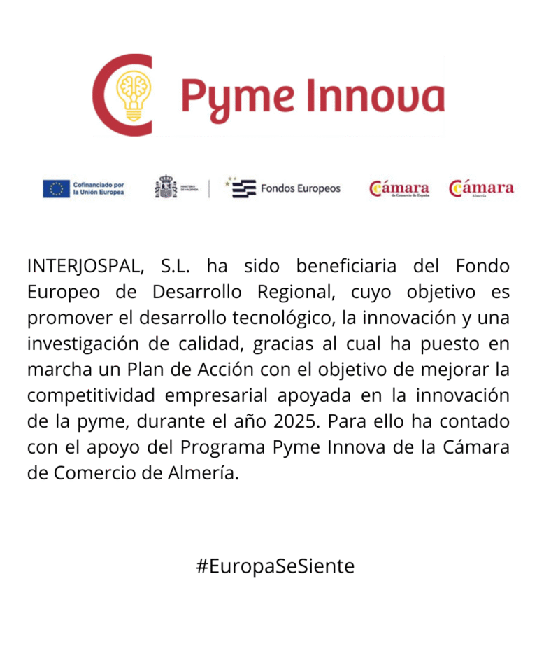 INTERJOSPAL, S.L. has been a beneficiary of the European Regional Development Fund, whose objective is to promote technological development, innovation, and quality research. Thanks to this, it has launched an Action Plan with the aim of improving business competitiveness supported by SME innovation during 2025. To this end, it has received support from the SME Innova Program of the Almeria Chamber of Commerce.